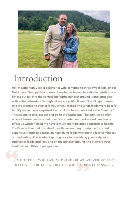 Written by a Nutritional Therapy Practitioner and mom of three, this e-book looks to biblical wisdom and how to nourish your body without chasing trends or falling into guilt. You’ll learn how to build balanced meals, embrace traditional foods, support your body’s natural detox pathways, and create daily rhythms.